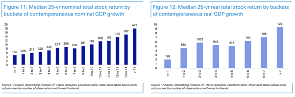 - Retornos nominais de ações têm forte correlação com o PIB nominal.